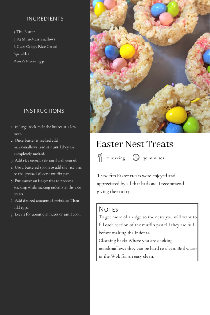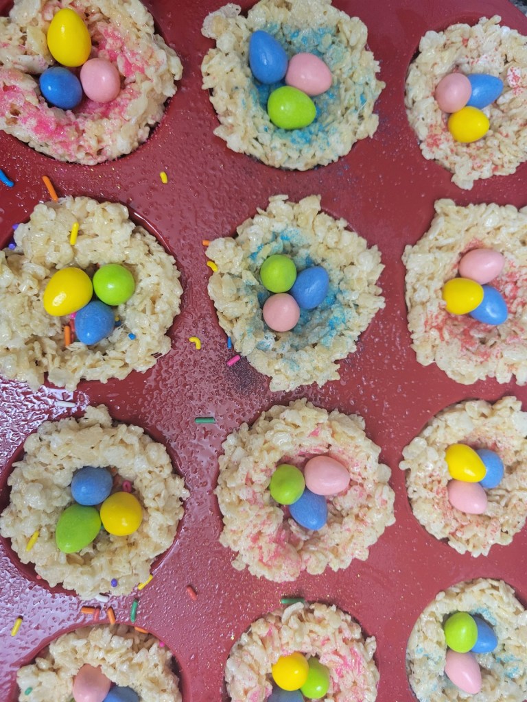 This year for Easter I wanted to be a little more festive and try some of the fun treats I’ve scrolled past over the years. One of those was a Birds Nest Rice Krispie Treat. I got the idea scrolling through Pinterest. Since I did not save the original pin, or I couldn’t find it, I went searching on the internet for recipes.