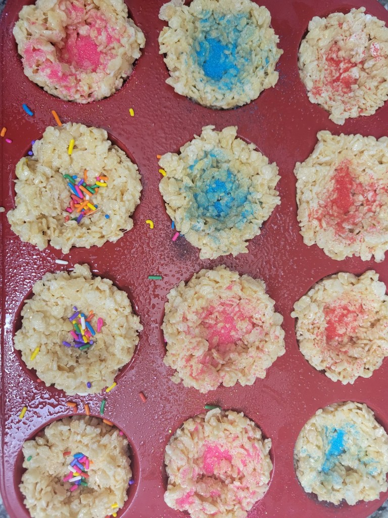 Next, to get the nest shape I put them into a greased silicone muffin pan and used my thumbs to make the indents of the nest. The silicone made it easy to get the Rice Krispies out once they had hardened. While the Rice Krispies were in the pan, I added sprinkles and the chocolate candy eggs. The sprinkles brought fun colors to the snacks and made the kids extra excited. This is an easy recipe to turn into a family activity. Just so that you can try exactly what I had, if you would like, here are the brands I did use: