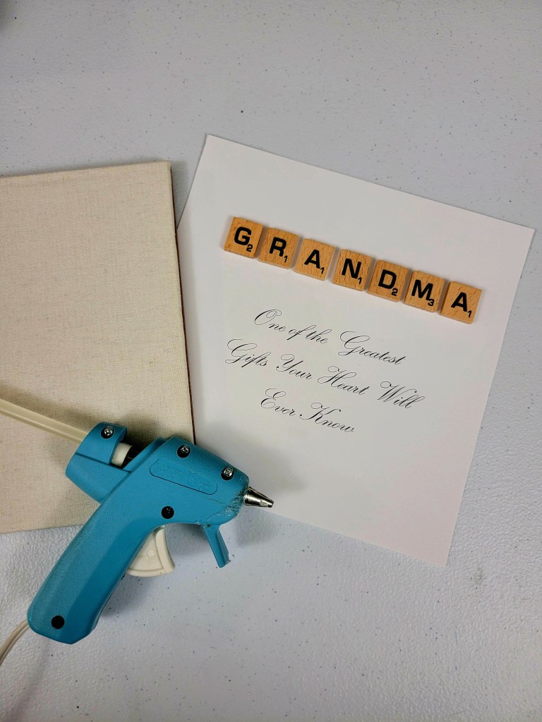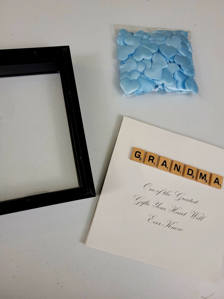 The first thing I needed to do was get the supplies, luckily it only takes a few. I ordered an 8X8 Shadow Box, Confetti, and Scrabble Tiles. I am very grateful for how quickly Amazon delivers; because it does allow me to do these last-minute projects. When the supplies arrived, the fun began. I pulled out the letters to spell GRANDMA. I printed a cute grandma quote centered and halfway down a paper. Then to get completely ready I set out all my supplies (Hot Glue Gun, Scissors, Pencil, etc.).