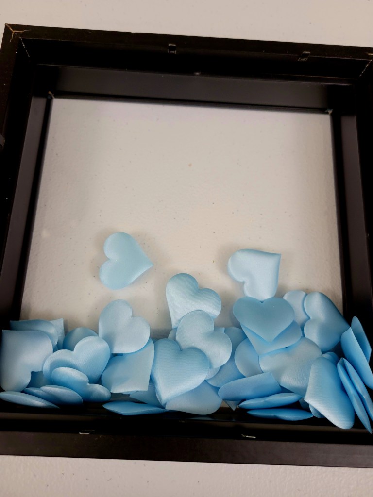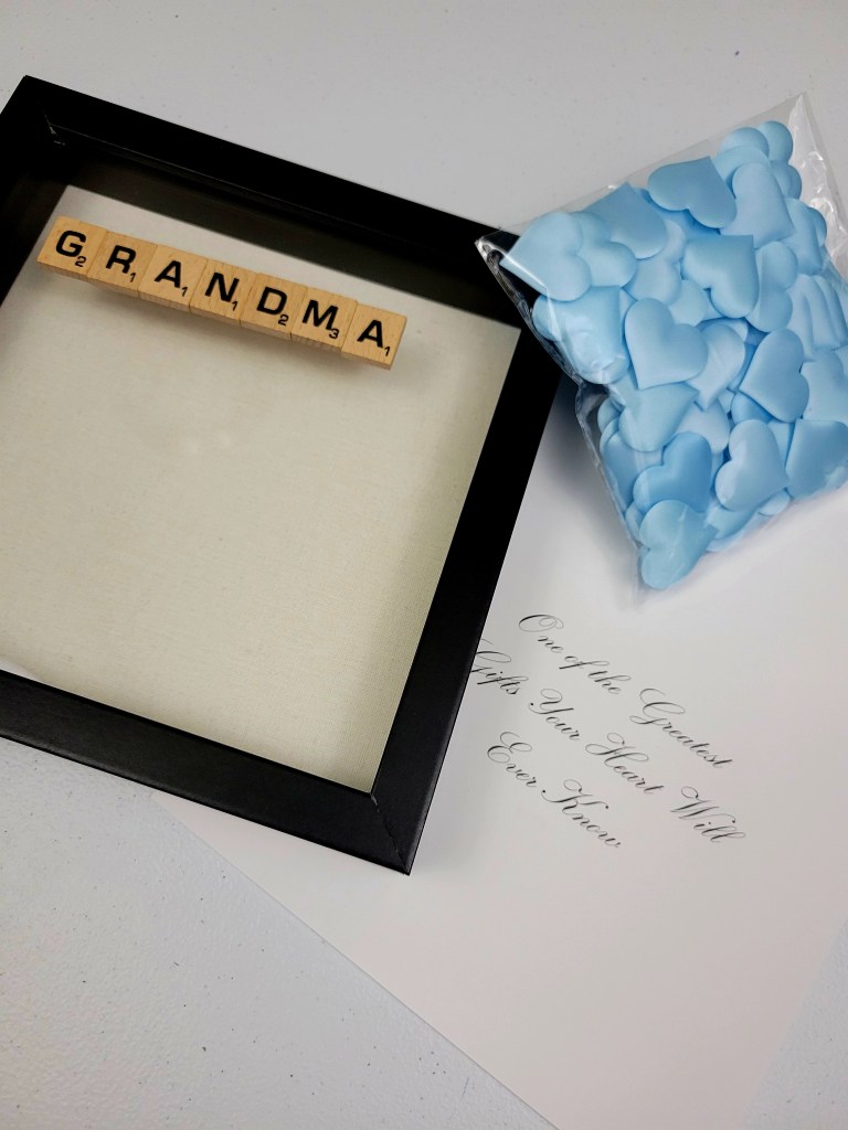 The next step will be to align the GRANDMA tiles the way you want them on the paper. The quote I used was “Grandma, one of the greatest gifts your heart will ever know.” Once all of the Scrabble tiles are aligned how you want them, use the glue gun to stick them onto the paper one at a time. Next, you will glue the paper to the back of the Shadow Box. When doing this I have two recommendations. The first is to make sure you know where the hanging piece is on the back so it will be right side up when hung. The second is when gluing, start in a corner and go slow, smoothing it out as you go. At least with my glue gun, if you try to do the whole paper at one time it will start to cool leaving lines where the glue sits. Once the entire paper is glued down throw the desired amount of confetti into the Shadow Box and put the back on.